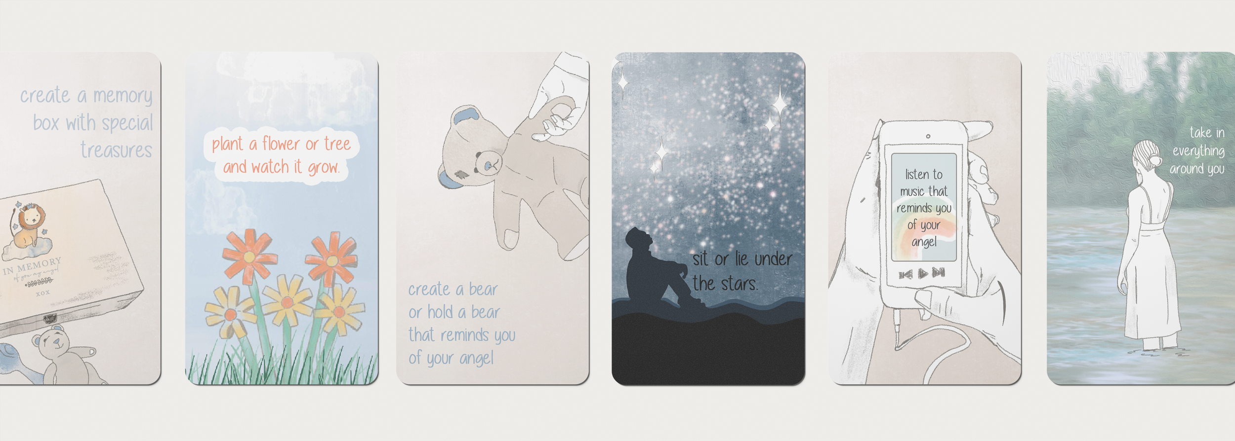 The artwork draws on everyday motifs, light, nature, and quiet moments, to reflect the lived experience of grief in a way that feels grounding and familiar. The result is a calm, emotive, memoir-style visual language that complements the words of support and allows families to engage with the story at their own pace.